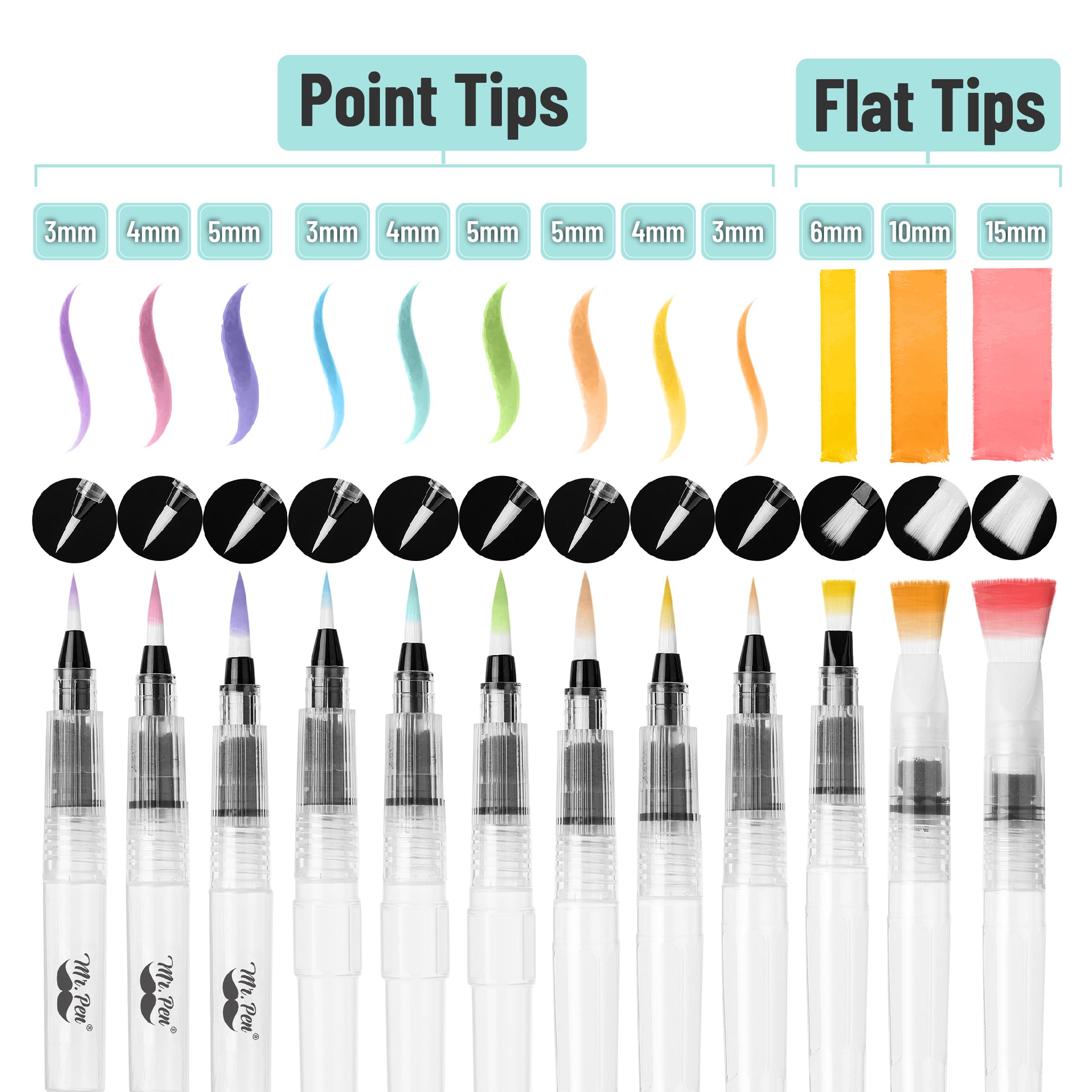 Mr. Pen- Watercolor Brush Pens, 12 pcs, 9 x Point Tips and 3 x Flat Tips Styles, Refillable Watercolor Pens for Acrylic, Gouache Painting, Crayons, Portable Water Brushes for Artists, Beginners, Kids
