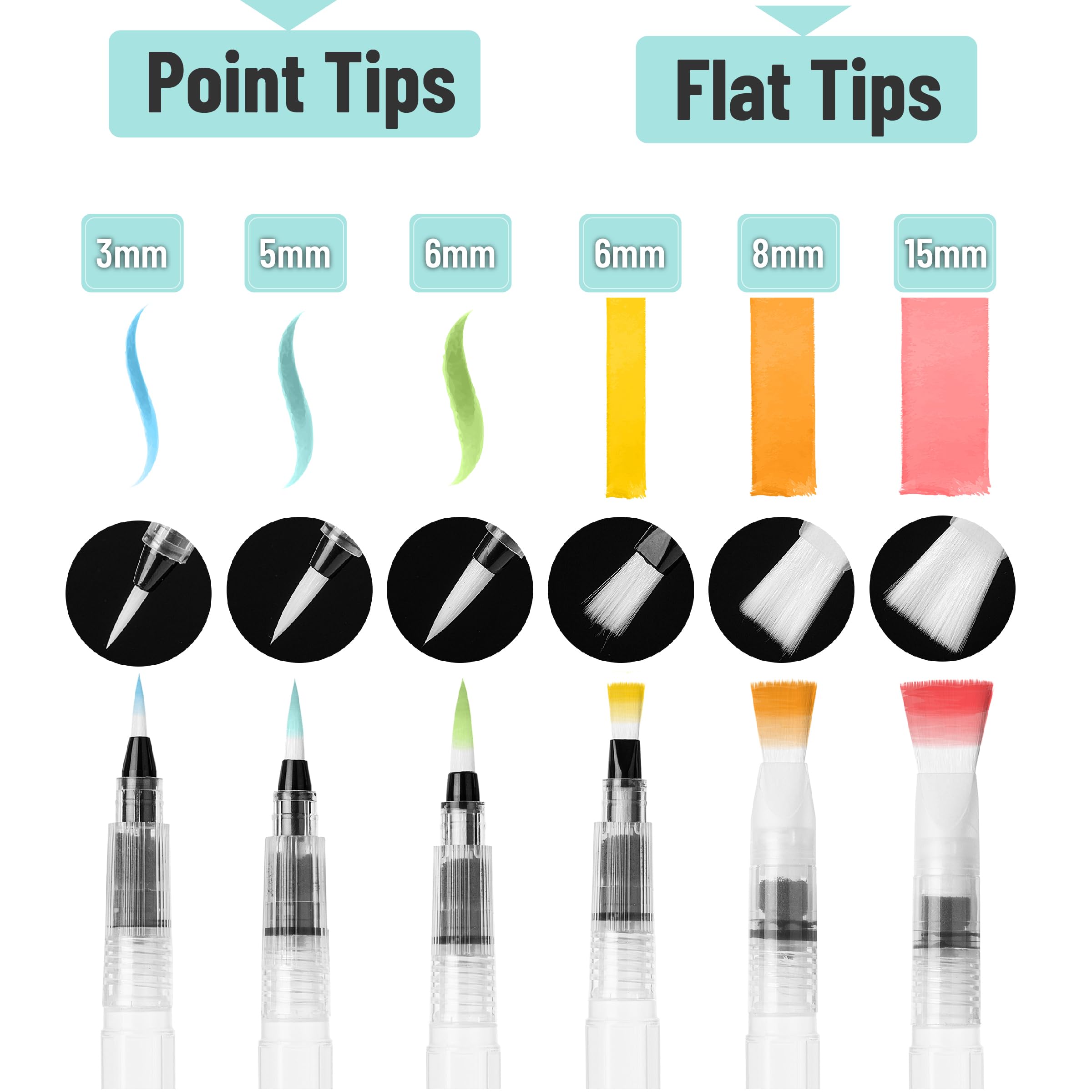 - Each brush pen features a built-in refillable water reservoir, allowing for seamless water control without the need for additional water cups.
